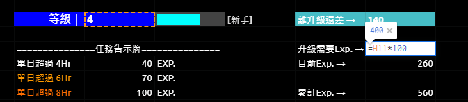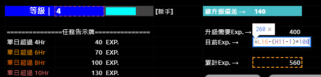 目前等級累計的EXP. = 總累計EXP. – (現在的等級-1) x 100