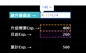 升級所需EXP. – 目前等級累計的EXP.