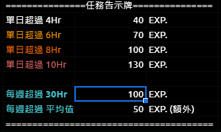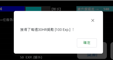 Browser.msgBox("獲得了每週30HR獎勵 [" + add_value + " Exp.] !"); //跳出通知